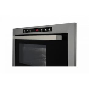 O forno conta com uma moldura com saída de ar na parte superior, proporcionando ventilação interna para resfriamento dos componentes. A estrutura do forno possui acabamento externo pintado na cor prata e interno em aço inox polido. A porta de vidro preto e o puxador com acabamento polido completam o design moderno.