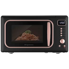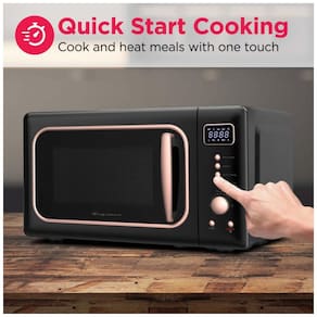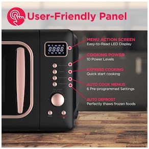 Forno micro-ondas retrô de bancada com capacidade de 20 litros, potência de 900W e 5 níveis de potência. Possui timer digital, funções de cozimento expresso e programas de descongelamento. Estrutura em metal pintado com interior em esmalte cerâmico. Acabamento preto com detalhes em rosa. Alimentação elétrica 110V.Função Grill