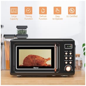 O micro-ondas retrô de bancada COSTWAY é um modelo compacto com capacidade aproximada de 20 litros, indicado para uso residencial em cozinhas, estúdios e pequenos apartamentos. Possui potência de 700W e cavidade interna equipada com prato giratório de vidro, que gira em 360° para distribuir o aquecimento de forma mais uniforme sobre os alimentos.?