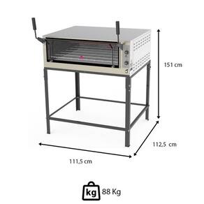 As dimensões externas do forno são 112,5 cm de comprimento, 111,5 cm de largura e 151 cm de altura.