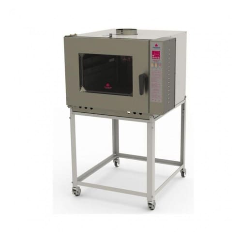 Este equipamento é utilizado para produção de pães e doces, proporcionando um cozimento uniforme. Fabricado em chapa com pintura epóxi. Frente, painel e porta em inox. Projetado com sistema de gaveta fixa de aquecimento com circuito (GLP) gás em baixa pressão e sistema integrado de aquecimento, que proporciona maior segurança, baixo consumo, facilidade de manuseio, praticidade na manutenção e eficiência no trabalho. Capacidade de cozimento: 5 esteiras de 580 x 700 mm com 25 pães de 50 g cada, totalizando 125 pães por fornada. Em uma hora, produz 375 pães de 50g. Obs.: O espaço entre as esteiras deve ser de 85 mm a 105 mm. Tempo de aquecimento: até 200°C de 14 a 22 minutos. Tempo de cozimento: de 15 a 20 minutos para pães de sal (francês). Motor: monofásico 1/4 CV