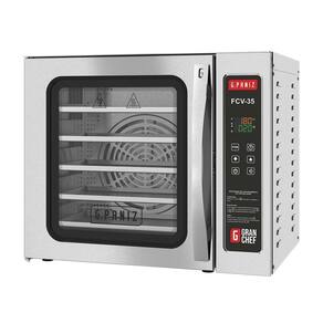 Forno Convector GranChef com Vapor FCV35 G.Paniz. Ideal para preparar alimentos servidos a todo o momento como pães de queijo, cookies, brownies, merengues, folhados, pastéis, pizzas, croissants, pão francês (50g), biscoitos e outros doces ou salgados de tamanho pequeno ou médio. Indicado para lojas de conveniência, padarias, lanchonetes, cafés, bistrôs e cozinhas gourmet. Estrutura total inox 430. ATENÇÃO: Acompanha 5 assadeiras, 35x35cm, em alumínio perfurado. AMPERAGEM: 11,8A. CAPACIDADE: 5 esteiras. CONSUMO MONOFÁSICO: 2,3kW/h. MOTOR: 1/30CV. POTÊNCIA: 3.300W. TEMPERATURA: 250ºC máxima. VOLUME: 75 Litros. PESO: 31,5Kg. DIMENSÕES (CxAxL) 64x54x68cm. Equipamento certificado pelo OCP 0070 conforme Portaria INMETRO - 148/2022. Forno Convector GranChef com Vapor FCV35 G.Paniz é na Atau.