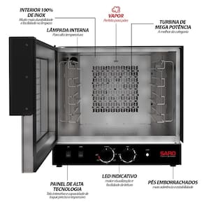 O Forno Turbo Elétrico SARO FT22 foi desenvolvido para garantir eficiência máxima e resultados profissionais em sua cozinha. Com 2.500W de Potência e Resistência Blindada, ele é capaz de assar alimentos de forma rápida e uniforme, sem emissão de fumaça, ideal para cozinhas compactas ou ambientes com pouca ventilação. Sua estrutura robusta com interior em Inox e 4 Esteiras proporciona maior capacidade e durabilidade, sendo a escolha perfeita para estabelecimentos comerciais ou uso doméstico avançado. Aproveite a alta performance do Forno Turbo Elétrico SARO FT22 e eleve o nível de sua cozinha. Eficiência, economia e praticidade em um só produto. Garanta já o seu!