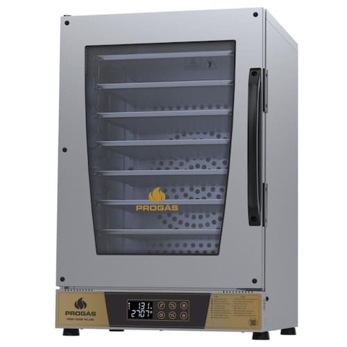 Características Técnicas: Estrutura em aço inox escovado Pés de borracha com regulagem de altura Porta com visor de vidro temperado Puxador de polímero isolante resistente a altas temperaturas Duplo travamento da porta Acompanha 8 esteiras de 35 x 35 cm Iluminação interna Aquecimento elétrico através de resistência blindada Controle digital multifuncional de fácil programação 10 receitas programáveis Função vapor Rack aramado com guia antiqueda Litragem: 77L útil | 106L total Temperatura máxima de 250C Hélice de duplo sentido de giro que garante uniformidade e sabor autêntico em todas as suas preparações