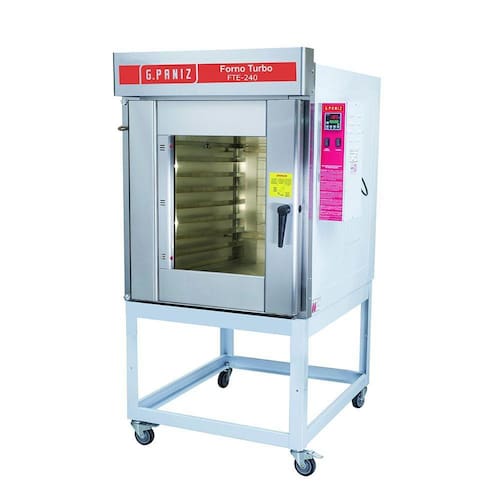 Indispensável em panificadoras, mini mercados, supermercados e comércios que façam a venda de pães e massas o Forno Turbo Elétrico Gpaniz possui câmara maior que proporciona um assado uniforme, porta esteiras ajustável em aço inox (comporta esteiras de 40x60, 45x65, 60x80 e 58x70) e consumo reduzido de eletricidade por isolamento em lã de rocha de 75mm.