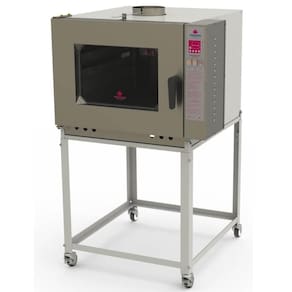 DESCRIÇÃO - Este equipamento é utilizado para produção de pães e doces, proporcionando um cozimento uniforme. - Projetado com sistema de gaveta fixa de aquecimento com circuito (GLP) gás em baixa pressão e sistema integrado de aquecimento, que proporciona maior segurança, baixo consumo, facilidade de manuseio, praticidade na manutenção e eficiência no trabalho. - Capacidade de cozimento: 5 esteiras de 580 x 700 mm com 25 pães de 50 g cada, totalizando 125 pães por fornada. Em uma hora, produz 375 pães de 50g. Obs.: O espaço entre as esteiras deve ser de 85 mm a 105 mm.