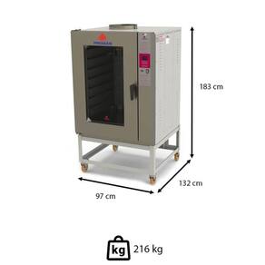 DESCRIÇÃO DO FORNO INDUSTRIAL ELÉTRICO COM VAPOR E CONTROLADOR DIGITAL - Estrutura em aço com fino acabamento em pintura epóxi; - Acabamento frontal em aço inox; - Isolamento térmico com lã basáltica; - Painel de comando com tecla geral, turbina e lâmpada; - Micro-chave que liga ou desliga a turbina ao abrir e fechar a porta; - Rodízios que facilitam o deslocamento; - Visor em vidro; - Iluminação interna; - Controlador digital para programar tempo, temperatura e vapor;