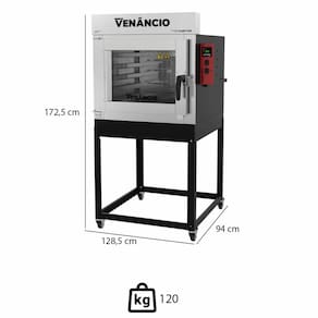 O Forno Turbo Venâncio Twister tem uma temperatura máxima de 230C, ideal para um cozimento rápido e uniforme, perfeito para padarias e cozinhas comerciais que exigem alta performance.