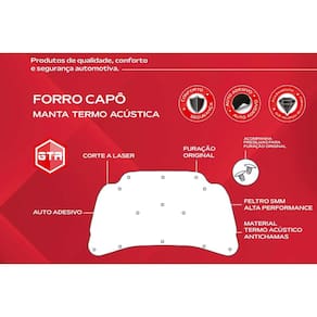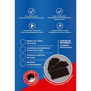 - Corte preciso a Laser, específico para cada veículo - Não necessita de ferramentas para instalação, autocolante - Reduz os ruídos do motor - Ameniza a temperatura externa do capô - Preserva a pintura do capô - Mantém a originalidade