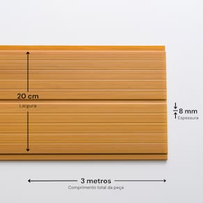 A embalagem contém 12 peças, cada uma com 3 metros de comprimento, 20 centímetros de largura e 8 milímetros de espessura. Totalizando 7,2 metros quadrados.