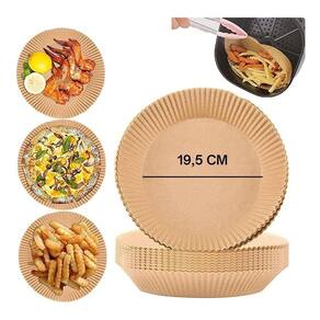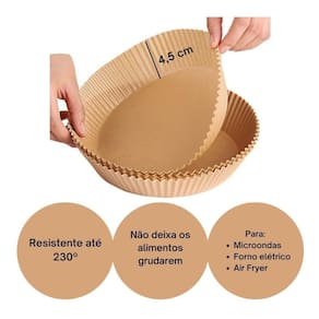 Características: Material: papel; Quantidade: 2 pacotes com 50 folhas 100 folhas no total ; Medida: 19,5cm l x 4,5cm a ; Temperatura máxima: 230ºc; Ideal para: air fryer, micro-ondas e forno elétrico.