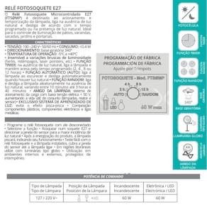 O Relé Fotosoquete Microcontrolado E27 é destinado ao acionamento e temporização da lâmpada, liga na ausência de luz natural e desliga de acordo com o tempo programado ou na presença de luz natural.
