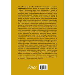 O livro Foucault, Proudhon, Malatesta: anarquismo e governamentalidade investiga as reflexões do anarquista francês Pierre-Joseph Proudhon e do anarquista italiano Errico Malatesta sobre o exercício do poder governamental, utilizando uma abordagem dos estudos da governamentalidade, noção elaborada por Michel Foucault para designar o campo estratégico das relações de poder que busca converter o que elas têm de móvel, transformável e reversível, em estados de dominação. Partindo do fato que, no Ocidente, as relações de poder foram constituídas de tal modo por uma proliferação indefinida de técnicas e mecanismos governamentais, que fizeram seu exercício assumir formas sempre mais excessivas e intoleráveis, o autor enfatiza a importância de se estudar essa prática complexa e singular que consiste em governar os indivíduos, transformada pelas sociedades modernas em um dos seus mais essenciais atributos. Mais do que uma prática imemorial, o autor afirma que o governo ganhou um desenvolvimento sem precedentes com a formação dos Estados modernos. Nesse processo, a soberania tomou emprestado do governo a perenidade do seu caráter natural e a permanência da sua natureza providencial: Estados nascem e morrem, mas o governo é eterno. E da sua eternidade, o governo remeterá sempre para a violência de uma força dominadora. No entanto, o autor mostra como o anarquismo foi a única tradição política, na história do Ocidente, que buscou direcionar, especificamente contra o governo, a crítica implacável de um saber que sondou sua existência insidiosa. Embora as resistências ao poder governamental sejam encontradas desde o início da formação do Estado moderno, foram os anarquistas que, jamais cessando de denunciá-lo, produziram, nas lutas em torno e contra ele, a enorme sistematização de um saber antigovernamental. Em suma, trata-se de uma obra importante para pensar, a partir do tríptico Foucault-Proudhon-Malatesta, a potencialidade extraordinária de produção de novas subjetividades presente nas formas de luta contemporâneas contra o governo. O livro não somente nos convida a constituir a nós mesmos como sujeitos transgressivos, mas também mostra o quanto é urgente, em nossa atualidade, a tarefa de constituir a si mesmo como sujeito anárquico.