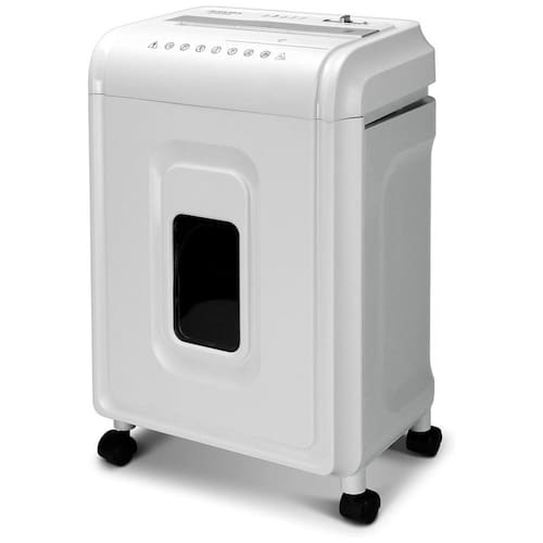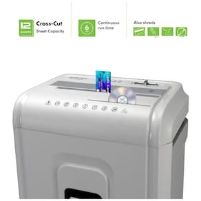 Corte transversal com capacidade para 12 folhas destrói CDs, DVDs, cartões de crédito e pequenos clipes de papel. Destrói papel, CDs, DVDs e cartões de crédito em pedaços pequenos 5 x 29 milímetros, nível de segurança P 4. Anti jam reverso automático para limpar congestionamentos de papel operação silenciosa. Tempo de execução contínuo sem parar de 6 minutos. Caixa de tração de 15 litros com luzes indicadoras LED de espera, superaquecimento, sobrecarga, porta aberta e status de compartimento cheio rodízios em movimento incluídos.