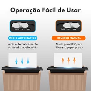 Corte em tiras de 6mm segurança no descarte ; Tritura até 6 folhas por vez; Fragmenta papel, cartões e grampos metálicos; Não fragmenta CDs ou clips metálicos; Adaptável em lixeiras de 28cm a 47cm de largura; Dimensões: 32 x 12 x 8cm; Peso: 1,3kg.