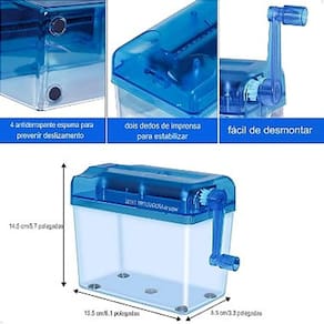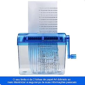 Portátil e fácil de usar Não necessita de eletricidade, sendo uma opção econômica Design transparente para monitoramento do processo Fragmenta papel em tiras finas para maior segurança Ideal para pequenos volumes de papel Perfeita para uso doméstico ou em pequenos escritórios Marca: Lorben Modelo: WST-123 Material: Plástico ABS Cor: Transparente/Azul Entrada de papel: 123mm Largura do corte: 3mm Capacidade: Até 2 folhas de papel A4 dobradas ao meio