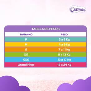 A nova fralda Cremer agora está mais fina e mais confortável, com proteção até 12h contra vazamentos! Além disso a fralda conta com um novo sistema antivazamento, composto por uma nova fita abre e fecha mais flexível e orelhas maiores que se ajustam ao corpinho do bebê, e uma camada super absorvente que distribui rápido o xixi pela fralda e evitando o retorno do líquido e garantindo que a pele do bebê fique bem sequinha. A nova Cremer traz proteção para noites tranquilas e dias mágicos, ainda mais confortáveis. • 12 horas de proteção para um bebê sempre sequinho e tranquilo; • Combinação de gel e barreiras altas que proporcionam absorção rápida e maior proteção contra vazamentos; • Camada superabsorvente que distribui rápido o xixi pela fralda e evita o retorno do líquido, garantindo que a pele do bebê fique sempre bem sequinha; • Nova fita mais flexível que abre e fecha quantas vezes for necessário sem estragar a fralda e orelhas maiores para mais conforto do bebê; • Cobertura externa macia e confortável como um tecido; • Cheirinho Encantador; • Dermatologicamente Testado.