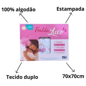 A linha luxo é versátil e ajuda as mamães no cuidado dos bebês. Podem ser usadas na hora de dormir, como protetor contra o vento e sol, base de trocador, para forrar qualquer superfície quando necessário, entre outros. Seu tamanho é excelente, pois possibilita inúmeras utilizações como: fraldinha para cochilar, de ombro, para proteger no bebê conforto ou carrinho, Possui estampas lindas, delicadas e alegres. Entre outras finalidades incríveis. É a nossa linha de maior qualidade, confeccionada com tecido duplo 100% de fibra de algodão proporciona conforto e maciez para a pele sensível do bebê. Tecido duplo e muito mais macia. As Fralda de Pano é mais do que essencial no enxoval do bebê. Esse kit com 5 unidades de fralda com estampas, é nota 10 no que diz respeito a relação custo X benefício. Nossa caixa de fraldas luxo é coringa para ser Utilizado em muitas funções, pois é grande, com tecido duplo e possui estampas lindas Principais Características: Quantidade: 5 Fralda de Pano Luxo Estampada Medidas: 70cm x 70cm Tamanho ideal Tecido Duplo Extra absorvente ou seja, existe duas camadas para maior durabilidade Extra Absorvente Composição: 100% Algodão macio e confortável Cor: Rosa, Azul ou Neutra Item super VERSÁTIL. para enrolar o bebê em forma de charutinho para acalmá-lo. para forrar superfícies em passeios. para cobrir o bebê conforto e/ou carrinho na hora da soneca em passeios. Sugestões de uso: Proteger sua roupa durante a amamentação Secar o bebê Limpar o bebê durante a amamentação Segurar o bebê durante o sono Cobrir o bebê-conforto ou o carrinho Para usar sobre o trocador E o que mais você precisar Dica: é um ótimo presente Estampa enviada para MENINA.