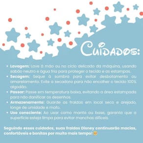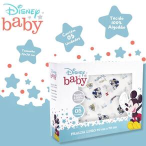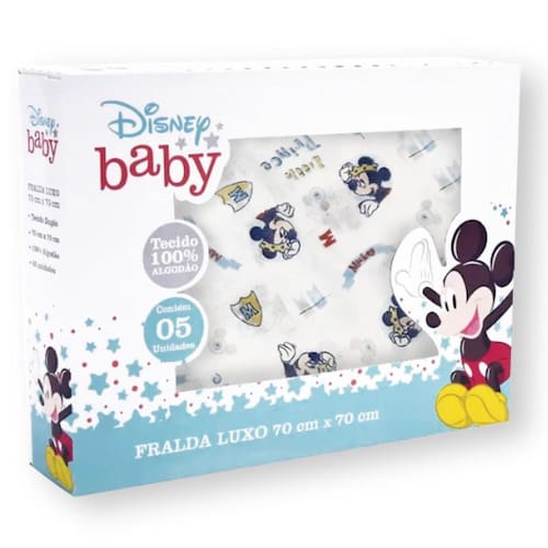 A caixa contém 5 fraldas luxo estampadas da Disney, perfeitas para o enxoval do seu bebê. Confeccionadas em tecido duplo 100% algodão, as fraldas combinam qualidade, conforto e alta absorção, sendo ideais para o dia a dia.