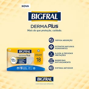 A Bigfral DermaPlus é a primeira fralda para adultos com extratos naturais hidratantes, que ajudam a prevenir irritações, mantendo a pele protegida e saudável, além de garantir até 10h de cuidado para pessoas com incontinência urinária severa. Além disso, a Fralda Descartável Geriátrica conta ainda com o sistema antiodor que neutraliza odores, proporcionando a sensação de frescor da pele.