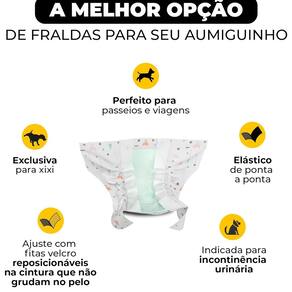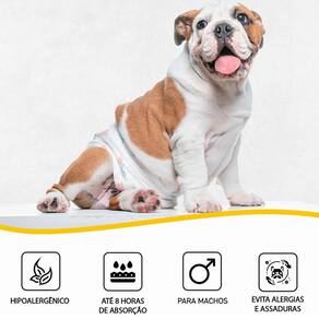 Fralda Descartável Para Cães Machos - Fralda Absorvente Para Cachorros Idosos e Filhotes - Tamanho M - Cintura de 33 a 53cm - 12 Unidades Se o seu pet está naquela fase de marcar território e isso está começando a estragar os seus móveis e dando mais trabalho na hora da limpeza, você precisa conhecer a Fralda Higiênica Ecofralda Macho Dogs Care. Com formato anatômico especialmente pensado para cães machos, a Fralda Dog's Care Macho funciona como uma faixa absorvente na cintura, deixando as patas e o escroto do cão livres de qualquer incômodo, garantindo higiene e conforto ao pet. Possui uma manta super absorvente com gel em flocos que garantem de 6 a 8 horas de absorção (dependendo do fluxo de urina) e fitas reposicionáveis para proporcionar melhor ajuste sem machucar. Além disso, é esterilizada para evitar proliferação de fungos e bactérias, além de evitar assaduras e alergias, garantindo segurança e conforto a qualquer hora. Para que serve a Ecofralda Dog's Care macho? A Dogs Care Fralda absorvente é indicada para: xixi fora de lugar;Demarcação de território;Incontinência urinária;Após procedimentos cirúrgicos;Passeios na casa de amigos e familiares;Visitas ao veterinário. Modo de usar Posicione a faixa com a parte absorvente em contato com o pipi do cão. Junte as extremidades na parte superior, colando a fita fecho aderente na superfície. Verifique se a fralda está firme e confortável. Composição Polímeros absorventes (gel em flocos), manta celulose, filme de polietileno, filtrante, fita hook e loop (fecho aderente), elásticos e cola quente. Medidas AproximadasM: Cintura: De 33cm a 53 cm