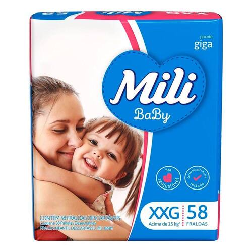 A Fralda Descatável Mili Baby Giga XXG Com 58 Unidades mantém o seu bebê sempre sequinho, porque possui quatro camadas de proteção e absorção. Contém barreiras laterais protetoras contra vazamentos, que se adaptam confortavelmente à perna do bebê. Além disso, conta com fita reajustável, que possibilita a abertura e o fechamento da fralda quantas vezes forem necessárias, até o ajuste perfeito ao corpo do bebê, sem danificar a fralda.
