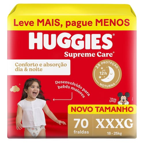 Fralda Huggies Supreme Care XXXG 70 Huggies Supreme Care Aberta é a única marca com a exclusiva tecnologia Xtra-Flex que mantém a fralda ajustada e flexível mesmo quando o bebê estiver em movimento. Os canais de absorção em formato de “X” distribuem melhor o xixi e dão mais conforto para o bebê, evitando assim quedas ou passos em falso em razão da fralda cheia. Agora disponível também no tamanho XXXG! A fralda Supreme Care é a companhia perfeita para você que busca máxima proteção enquanto seu bebê se movimenta. Graças à sua tecnologia exclusiva, é a única com canais em formato de X, com uma anatomia que se adapta aos movimentos do seu bebê, oferecendo mais liberdade de movimento. Com ajustes elásticos na cintura, barreiras e orelhas elásticas para máxima flexibilidade e conforto, oferece duas vezes mais proteção noturna comparada às fraldas Huggies sem a tecnologia Xtra-Flex. Agora disponível no tamanho XXXG, para bebês grandinhos de até 25kg* * com base em estudos antropométricos (técnica de mensuração do corpo) da Kimberly Clark para bebês até 25kg. Pode variar de acordo com o corpo do bebê - DESENVOLVIDA PARA BEBÊS MAIORES: Pensando nos bebês grandinhos, de até 25kg.* - 2 VEZES MAIS PROTEÇÃO NOTURNA: Nossas fraldas oferecem uma barreira avançada que proporciona o dobro da proteção durante a noite, mantendo o bebê confortável e seco até a manhã. Descanse tranquilo sabendo que seu bebê está protegido. - MÁXIMA FLEXIBILIDADE: Cintura, barreiras e orelhas elásticas. Indicadores para troca de tamanho. Canais em X e anatômicos únicos que se adaptam aos movimentos do bebê. Tecnologia Xtra-Flex para distribuição rápida e uniforme. - ABSORÇÃO ESPECIAL: Nossa tecnologia absorve xixi e cocô líquido em segundos, prevenindo reações cutâneas e desconfortos. A distribuição mais rápida e uniforme* garante uma pele seca por mais tempo (*Vs. Fraldas Huggies sem a tecnologia Xtra-Flex). - MAIS CONFORTO E ABSORÇÃO DIA & NOITE: máximo conforto durante o dia e absorção reforçada para noites tranquilas (*Mais conforto vs. Huggies Tripla proteção e absorção vs. versão anterior de Huggies Supreme Care sem absorção reforçada). . * com base em estudos antropométricos (técnica de mensuração do corpo) da Kimberly Clark para bebês até 25kg. Pode variar de acordo com o corpo do bebê