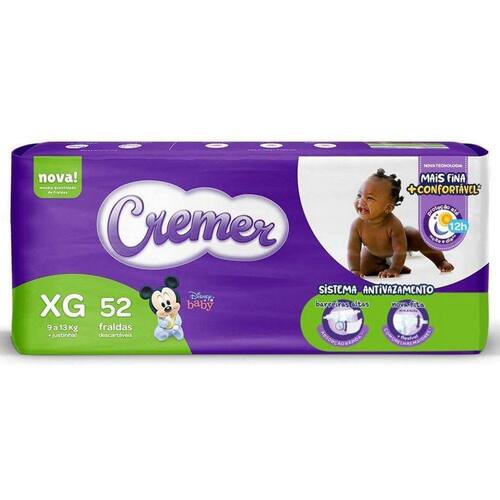 Fralda Cremer Disney Baby Com a fralda Cremer Disney Baby seu filho vai ficar muito mais sequinho e confortável, tendo também uma embalagem mais compacta, fácil de guardar. Com a camada superabsorvente (que garante maior absorção do xixi e, através das barreiras mais altas, maior proteção contra vazamentos) e a cobertura macia na parte externa seu bebê pode ficar até 12h se divertindo sem incômodos, tem a cintura ajustável com fita gruda e desgruda. Você agora pode ficar tranquila, tendo certeza que seu bebê está bem confortável e protegido! As 52 fraldas tamanho XG deste pacote são ideais para bebês