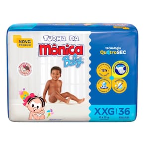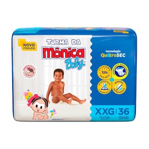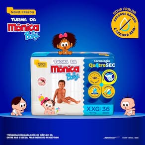 Fralda Infantil Turma da Mônica Baby Mega Tamanho XXG A Turma da Mônica Baby uniu proteção e conforto em uma nova opção de fralda, para garantir que seu bebê cresça feliz e tenha as melhores lembranças da sua infância. A Nova fralda Turma da Mônica Baby possui a nova Tecnologia QuatroSec para que ele fique calmo, tranquilo e seguro durante o dia e a noite toda. Conta com um exclusivo sistema de canais que distribui mais rápido o xixi, barreiras anti-vazamento e uma fina camada extra que ajuda a manter o bebê sequinho por até 12 horas, além de cintura elástica que proporciona um perfeito ajuste no corpinho. A Nova fralda Turma da Mônica Baby possui a nova Tecnologia QuatroSec; com um exclusivo sistema de canais que distribui mais rápido o xixi, barreiras anti-vazamento e uma fina camada extra que ajuda a manter o bebê sequinho por até 12 horas, além de cintura elástica que proporciona um perfeito ajuste no corpinho. A Turma da Mônica Baby é uma marca de excelência no mercado de fraldas infantis há mais de 25 anos. A marca e sua turma estão presentes no coração dos brasileiros há mais de 3 gerações, e agora também faz parte do portfólio da Ontex. Os novos produtos foram pensados e elaborados para as mamães e os papais que, assim como nós, valorizam a tradição e os valores culturais aprendidos na infância, alinhado com o conforto e a qualidade dos produtos Turma da Mônica para seu bebê. Modo de uso: 1. Coloque o bebê sobre a fralda aberta com as fitas na parte traseira. 2. Abra as fitas agarradinhas e ajuste a fralda no corpinho do bebê posicionando as fitas sobre a faixa frontal branca.