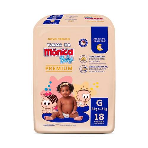 Fralda Turma Da Mônica Premium Tamanho G 18 Unidades Turma Da Mônica A Fralda Premium Turma da Mônica, tamanho G, com 18 unidades, é ideal para oferecer conforto e proteção aos bebês em fase de crescimento. Desenvolvida com materiais de alta qualidade, esta fralda conta com uma camada interna superabsorvente que retém a umidade e mantém a pele do bebê seca por mais tempo, ajudando a prevenir assaduras e irritações. Seu formato anatômico proporciona um ajuste perfeito ao corpo do bebê, permitindo liberdade de movimentos durante o dia e a noite. As barreiras antivazamento laterais reforçadas proporcionam uma proteção extra, evitando vazamentos mesmo nas situações mais desafiadoras. A camada externa é suave e respirável, garantindo que a pele do bebê permaneça fresca e confortável. Com a Fralda Premium Turma da Mônica, você garante que o seu bebê esteja protegido e confortável em todos os momentos.