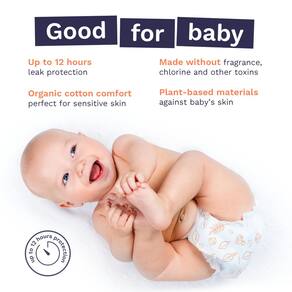 - Sem vazamentos: mantendo seu pequeno confortável e seco, nossas fraldas oferecem até 12 horas de proteção contra vazamentos e apresentam uma camada à prova d'água à base de plantas com microporos para permitir que a pele do seu bebê respire.