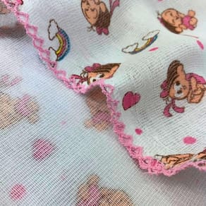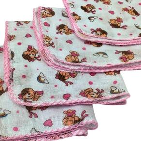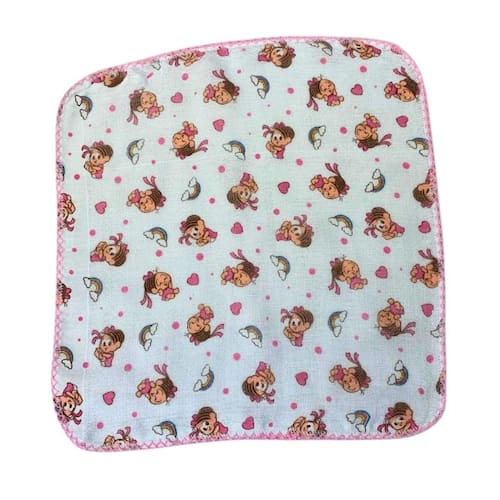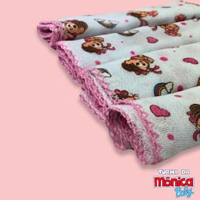 Acabamento em crochê feito a maquina Tamanho 33x33cm Idade: A partir do primeiro dia de vida Composição: 100% Algodão macio e confortável Tecido Duplo Extra absorvente ou seja, existe duas camadas para maior durabilidade Marca Incomfral Estampa: Mônica/Feminino