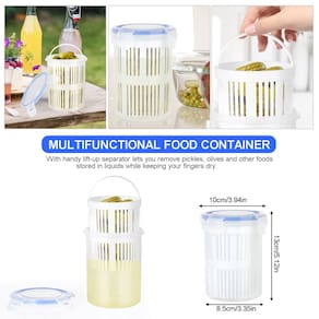 2. Recipiente multifuncional para alimentos: expanda suas opções de armazenamento com este conjunto de economia de alimentos. É ideal para azeitonas, jalapenos, picles, queijo fatiado ou outros alimentos de delicatessen que precisam ser mantidos em seus próprios sucos ou salmoura. Perfeito para guardar cenouras, maçãs, pedaços de abacaxi ou outras frutas. Com um prático separador de elevação, você pode remover picles, azeitonas e outros alimentos armazenados em líquidos, mantendo os dedos secos.
