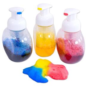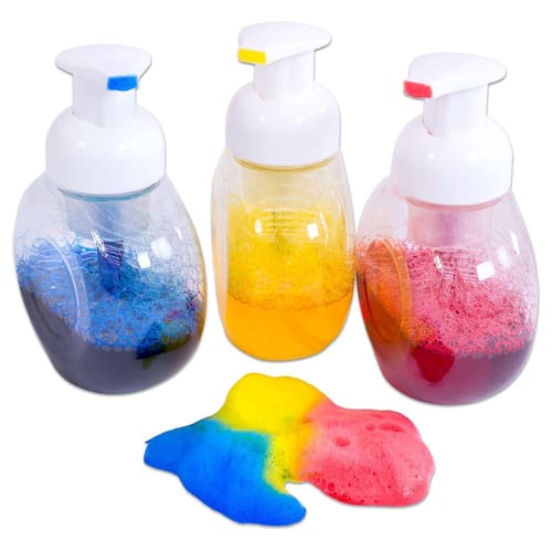 Crianças de todas as idades vão adorar a experiência sensorial de usar garrafas de tinta de espuma Roylco, que transformam aquarelas líquidas em tinta de espuma. Cada embalagem vem com três garrafas de plástico transparente com dispensadores de bomba de rosca, bem como instruções para criar tinta de espuma. Para maiores de 3 anos. - Frascos de tinta de espuma Roylco - Pacote de 3 frascos de tinta de espuma, 3 pacotes de 3,5 x 5 polegadas -