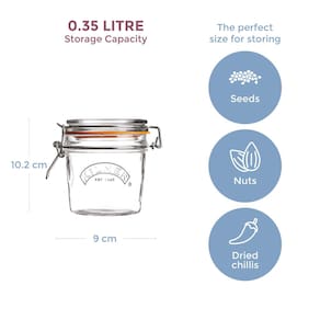 Frasco de vidrio redondo Kilner con tapa abatible | 350 ml - TAMAÑO | La capacidad del frasco es de 0.35 litros / 350 ml, tamaño ideal para conservar mermeladas, jaleas, cremas de limón y almacenar alimentos secos como semillas y nueces. - DURABILIDAD | Fabricado con vidrio sodocálcico de alta calidad, con claridad cristalina y grosor uniforme en las paredes que evita puntos débiles. Este frasco es apto para lavavajillas. No verter agua hirviendo directamente dentro. - VIDRIO SUSTENTABLE | El vidrio Kilner está hecho de ingredientes naturales, por lo que no libera químicos ni toxinas a los alimentos. Es libre de BPA y no absorbe olores, sabores ni manchas. Además de ser más saludable, es reutilizable y duradero, no de un solo uso. - LA HISTORIA DE KILNER | El frasco Kilner autêntico, inventado por John Kilner & Co en Inglaterra, sigue siendo tan apreciado y exitoso como hace más de 180 años.