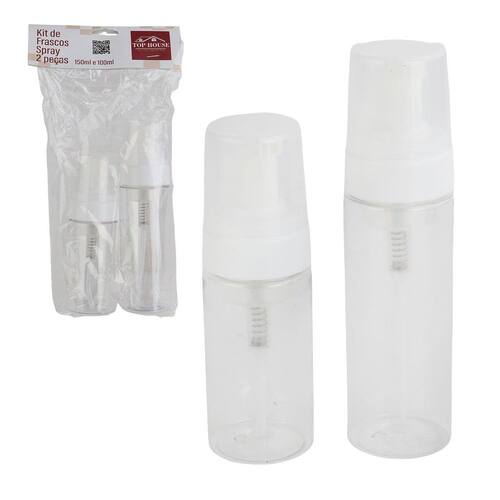 Frasco Spray Pump de Plástico 2 Peças 100ml Kit com 2 frascos, fabricado em plástico resistente, de alta qualidade e durabilidade. Possui um pump spray com tampa, ideal para armazenar cosméticos, sabonete líquido e levar na bolsa ou mochila. Contém: 1 Frasco de 100ml (14,5x4cm), 1 Frasco de 150ml (18,5x4cm).\nEspecificações:\nMarca : TOP RIO\nTipo de material : Plástico\nCores ou Estampa : Transparente\nDimensões do Produto : 27 X 14 X 4 CM\nDimensões da Embalagem : 27 X 14 X 4 CM\nPeso Bruto (Gramas) : 0.111 Marca: Não Informado