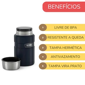 Tecnologia de Ponta: Graças à sua parede dupla com isolamento a vácuo, uma inovação patenteada pela Thermos, suas refeições permanecem quentes por até 14 horas e frias por até 24 horas! Além disso, a parte externa permanece fria ao toque quando há alimentos quentes, e sem condensação quando está com alimentos frescos, proporcionando conforto e praticidade incomparáveis.