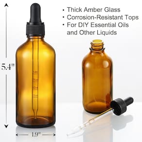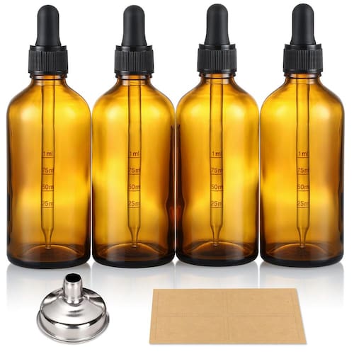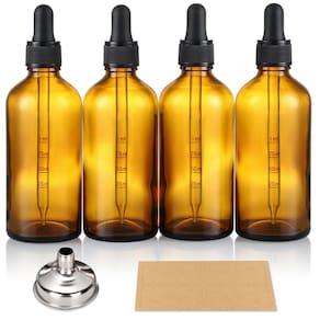 - ? O pacote inclui: 4 embalagens de garrafas de vidro âmbar escuro de 4 onças (120 ml) com conta-gotas em escala calibrada (1 ml), 1 funil de aço inoxidável e 4 rótulos. Tamanho - 1,9 polegadas de largura, 5,4 polegadas de altura.