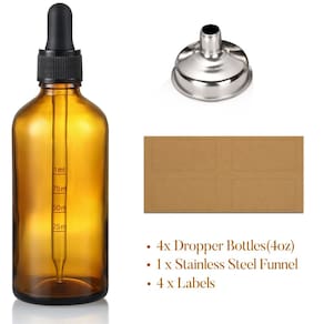 O pacote inclui: 4 embalagens de 4 frascos de vidro âmbar escuro de 4 onças (120 ml) com conta-gotas em escala calibrada (1 ml), 1 funil de aço inoxidável e 4 rótulos. Tamanho - 1,9 polegadas de largura, 5,4 polegadas de altura.