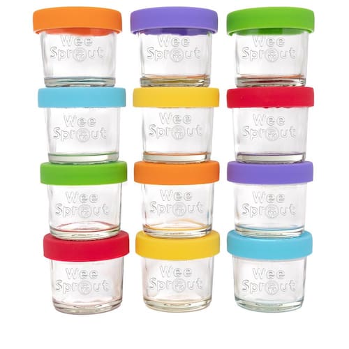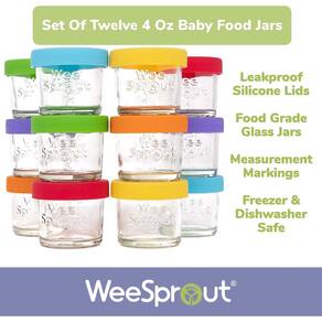 Weesprout Frascos de vidro para armazenamento de alimentos para bebês (113 g, conjunto de 12): nossos frascos de vidro grandes e mini com tampa para alimentos são a melhor solução para armazenar com segurança as refeições do seu pequeno. Feitos de vidro de qualidade alimentar de alta qualidade e tampas que vêm nas cores laranja, roxo, verde, azul, amarelo e vermelho, esses potes de comida de bebê de vidro garantem a pureza e o frescor dos alimentos para bebês. Com uma capacidade generosa de 113 g, nosso conjunto de recipientes de preparação de refeições para bebês ou bebês é perfeito para distribuir alimentos caseiros para bebês. O design seguro para freezer permite que você prepare e armazene refeições com antecedência, garantindo um suprimento constante de opções nutritivas. Recipientes de armazenamento reutilizáveis para preparação de refeições eliminam a necessidade de recipientes descartáveis e reduzem o desperdício. Estes recipientes de preparação de refeições seguros para freezer são seguros para micro-ondas para aquecimento conveniente. Não recomendamos colocar no micro-ondas seu pote de comida de bebê de vidro com as tampas, pois são de silicone. Estes recipientes de armazenamento de leite materno para bebês podem ser colocados no micro-ondas. A limpeza também é fácil, pois nosso conjunto de recipientes de armazenamento para freezer de leite materno pode ser lavado na lava-louças. Desde os estágios iniciais dos purês até as refeições infantis, este conjunto versátil de recipientes de alimentos de vidro é ideal para todos os estágios de alimentação. --- Recipientes para lanches com tampas de silicone Instruções: deixe a comida do bebê esfriar antes de armazenar - Deixe espaço para expansão ao encher seus pequenos frascos - Evite ir imediatamente do freezer para água muito quente - - Recipientes de armazenamento de alimentos para bebês Dicas de armazenamento: Alimentos para bebês contendo aves, peixe, carne ou ovos devem permanecer frescos na geladeira por 24 horas e congelados por 3 meses. Alimentos para bebês feitos apenas com frutas e vegetais devem durar 3 dias na geladeira e 6 meses no freezer. --- Sobre nós: A WeeSprout foi fundada em 2015 por uma equipe de marido e mulher que precisa de produtos infantis saudáveis e ecológicos que não quebrariam o banco. Tudo começou com nossa bolsa de comida reutilizável para bebês, então uma coisa boa levou a outra. - ? Frasco de vidro de 118 ml com tampa: prepare em lote e armazene várias refeições para o seu pequeno ao mesmo tempo com este conjunto de recipientes de armazenamento de comida de bebê. Faça refeições completas ou use as marcações de medição em nossos frascos de armazenamento de vidro com tampas para preparar porções de purê do tamanho de lanche – ou misture e combine diferentes porções para uma refeição equilibrada! - ? Recipientes multiuso para todos os estágios de alimentação: use estes frascos versáteis de preparação de refeições para armazenar purês, comida de bebê, leite materno e muito mais. Certifique-se de apertar a tampa com segurança para armazenamento do leite materno para evitar vazamentos! Nossos frascos de vidro de 118 ml com tampas são um item essencial para a lista do bebê e um investimento que você usará ano após ano! - ? Marcadores de medição: cada um dos nossos frascos de 118 ml com tampas tem marcações de medição de onças e ml em relevo e a tampa vem nas cores laranja, roxo, verde, azul, amarelo e vermelho brilhante. Prepare refeições completas ou use os marcadores de medida em nossos mini frascos infantis com tampas para garantir porções adequadas. - ? Estrutura de longa duração: os pequenos recipientes de vidro WeeSprout com tampas são feitos com vidro espesso de grau alimentício e tampas de silicone rígido premium – isso significa que nossos recipientes de vidro para alimentos para bebês são a alternativa perfeita para recipientes de uso único e materiais frágeis que não duram! - ? Seguro para micro-ondas, máquina de lavar louça e congelador: este conjunto de frascos de vidro de 118 ml para micro-ondas, lava-louças e freezer facilita a hora da refeição do início ao fim. Use nossos recipientes de vidro com tampas para armazenar refeições pré-fabricadas no freezer, jogue-as no micro-ondas e limpe na lava-louças para facilitar a reutilização! (veja as instruções para micro-ondas)
