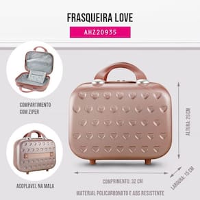 A frasqueira da Jacki Design é essencial para a sua viagem! Feito de material Policarbonato e ABS resistente. Possui um amplo espaço interno, divisória central com bolsos organizadores e sistema de alça carona para acoplar no carrinho da mala e facilitar no transporte. Ideal para guardar maquiagem, documentos, e acessórios pequenos.