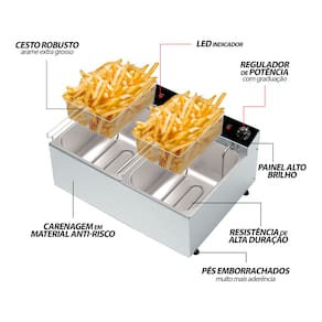 FRITADEIRA ELETRICA 2 CUBAS DE 5L: Esta fritadeira e a revolucao das fritadeiras eletricas, com uma resistencia de mega resistencia, consegue fritar os alimentos muito mais rapido e deixá-los muito mais crocantes. Com termostato automatico, voce apenas deve definir a temperatura que deseja e a resistencia ira se desligar e ligar sozinha para manter a temperatura definida.