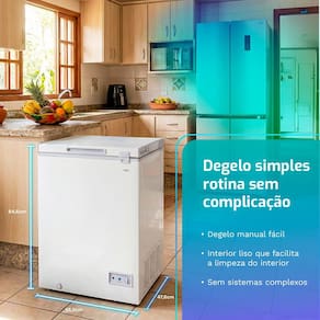 Sem segredo quando chega a hora de descongelar, o processo é direto: desligar o freezer, abrir a tampa, aguardar o gelo derreter e secar o interior. O bojo liso facilita essa limpeza, sem necessidade de desmontar componentes ou lidar com sistemas eletrônicos sensíveis.