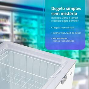 A capacidade de 250 L é ideal para complementar a geladeira principal e manter um bom volume de carnes, congelados, polpas, sorvetes e marmitas. Para famílias que compram em atacarejo ou pequenos negócios que não querem partir para uma câmara fria, é o meio-termo perfeito entre tamanho, consumo e investimento.