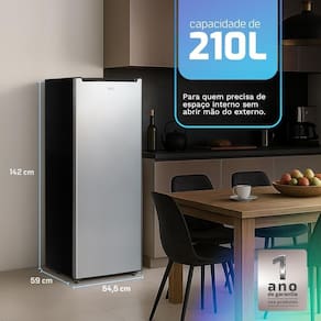 O Freezer e Conservador HQ-210FVRDFL foi feito para quem precisa de capacidade real sem abrir mão da flexibilidade. São 210 litros úteis em um produto 2 em 1: escolha entre freezer (para estocar carnes, refeições e sobremesas por longos períodos) ou refrigerador (para bebidas, frios e preparo do dia a dia). Quando a rotina pede resposta rápida, o FAST FREEZER ajuda a recuperar a temperatura após as compras. E para a conta de luz, a etiqueta ENCE A+++ com 22,41 kWh/mês (versões 127 V e 220 V) indica Menos 30% de consumo na própria lâmina do INMETRO.