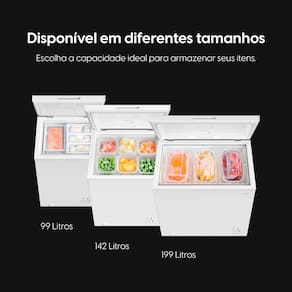 Disponível em três capacidades (99L, 142L ou 199L) nas tensões 110V e 220V, ele se adapta ao seu espaço e à sua necessidade, garantindo armazenamento inteligente e prático. O controle de temperatura varia de -24°C a +5°C, permitindo utilizá-lo tanto como refrigerador quanto como congelador, e armazenar desde carnes e frios até bebidas e sorvetes.