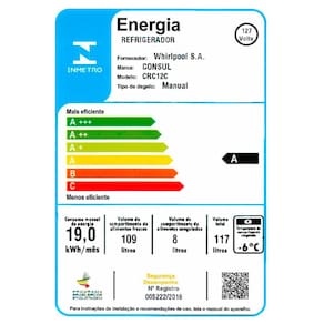 Especificacoes Tecnicas: Classificacao energetica: A. Consumo aproximado de energia: 36,5 KWh/mes Compartimento Extra Frio: 1 Congelamento rapido: Nao Porta reversivel: Nao Armazenamento liquido: 142 l Capacidade bruta: 166 l Cestos deslizantes e removiveis: 5 Funcao: Freezer Informacoes de uso na porta: Sim Nao contem CFC: Sim Pes: 4 Portas: 1 Prateleiras: Nao Rodizios para transporte: Sim Tipo de degelo: Manual Tipo de freezer: Vertical Gavetao: 1