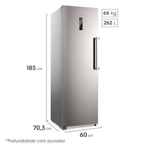 O Freezer Electrolux Experience 355L RTI4S com Inox look é a combinação perfeita para sua cozinha, e juntamente com a Geladeira Electrolux Experience 355L RTI4S1 é possível unir o conjunto2 com o Conector3, ficando lado a lado, como side by side. Mais espaço todas suas escolhas, com economia de energia e alimentos preservados por mais tempo. Possui a Tecnologia Inverter, que mantém a temperatura mais estável enquanto preserva seus alimentos e bebidas com economia de até 48%4 de energia e ainda conta com a certificação de eficiência energética A+++ que garante menor consumo. Com Smart Capacity, quando combinados, a Geladeira e o Freezer de grande capacidade da linha Electrolux Experience somam 617L para armazenar e organizar de maneira inteligente tudo o que precisar. Aproveite as Portas reversíveis2 e escolha o lado da sua Geladeira ou Freezer de acordo com sua necessidade, abertura da direita para a esquerda ou da esquerda para a direita. O Slide & Adapt é um compartimento especial na porta do freezer que pode ser aberto em um ângulo ideal de até 30 para simplificar o acesso e armazenamento de embalagens grandes, como por exemplo, caixas de pizza congelada. Sustentável, o freezer possui Gás ecológico R600a, que não agride o meio ambiente e nem a camada de ozônio. Desfrute de gelo sempre à mão com o Ice Twister, basta girar a bandeja para que o gelo caia no compartimento inferior e tenha suas bebidas favoritas ainda mais refrescantes, sempre que quiser. Além disso, complete sua cozinha com a Moldura Trim Kit para Freezer e Geladeira5, o acessório ideal para um design sofisticado e perfeitamente integrado ao ambiente. Características Tipo: Vertical Frost Free Capacidade: 262 litros Painel Eletrônico Controle Automático de Temperatura Portas Reversíveis Tecnologia de Refrigeração Inverter Prateleiras: 2 Porta / 5 Internas Alarme de Porta Aberta Especificações Técnicas Modelo: FTI4S Cor: Cinza Voltagem: 110V (não é Bivolt) EAN: 7909569410530 Garantia: 12 meses Dimensões e Peso Dimensões do produto sem embalagem (AxLxP): 1850,5x595x651 mm Dimensões do produto com embalagem (AxLxP): 1932x640x680 mm Peso do produto sem embalagem: 66,00 kg Peso do produto com embalagem: 72,00 kg Itens Inclusos 01 Freezer Electrolux Experience Produto possui certificação de segurança compulsória, certificado pelo IFBQ, organismo acreditado pela CGCRE do Inmetro. Serviço de Instalação e Orientação de Uso Para sua comodidade e segurança, a Fast Shop dispõe do serviço de Instalação e Orientação de Uso*. Agendamos o serviço para você, executamos a instalação com equipes próprias especializadas e autorizadas pelo fabricante, ensinamos como utilizar os produtos da melhor forma e temos uma área de qualidade para acompanhar e garantir que tudo dê certo. É rápido e fácil. Você pode contratar o serviço com o nosso Televendas pelo tel.: 3003-3278 ou em uma de nossas lojas. Consulte os valores e regiões atendidas. * Verifique com nossos vendedores se a Fast Shop realiza a instalação desse produto.