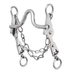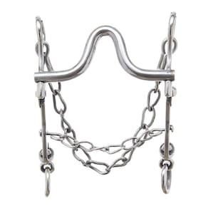Freio Tostão para Cavalos marca Bronc-Steel, possui bocal de ferro fixo com portal alto e hastes de aço inox articuladas. Acompanha barbela de corrente.