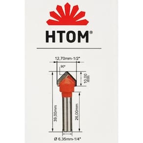 A Fresa Rasgo em V 1/2 Pol. Haste 1/4 para Tupia Profissional HTOM é ideal para cortar, aparar, entalhar, nivelar e realizar acabamentos gerais em madeira. Com um ângulo de 90 graus, essa fresa garante cortes precisos e de qualidade.